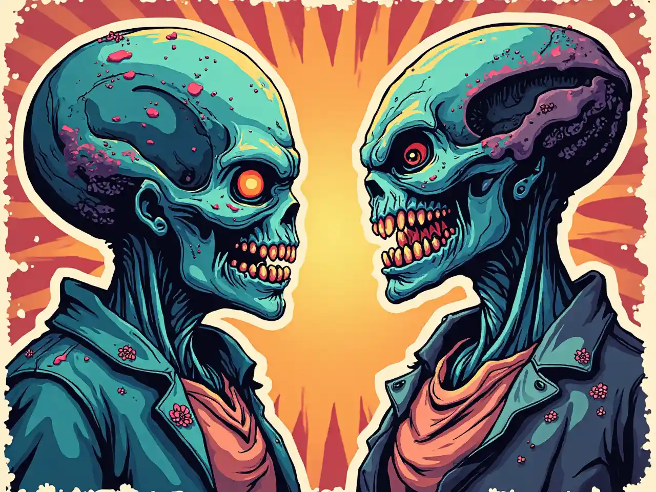 ਪੌਪ ਆਰਟ ਚਿੱਤਰ, ਕੱਟ-ਆਉਟ ਸਟਿੱਕਰ ਡਿਜ਼ਾਈਨ, ਜ਼ੋਮਬੀਜ਼ ਬਨਾਮ ਏਲੀਅਨ