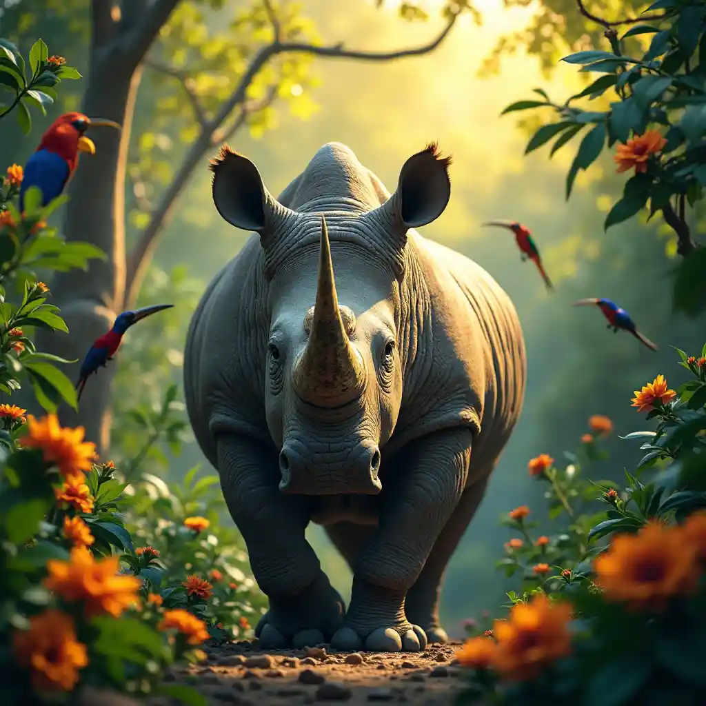 Zapierająca dech w piersiach fotografia, która uchwyca istotę afrykańskiej dżungli, gdy z bujnych liści wyłania się wspaniały nosoros. Wzdłuż głowy rozświetlony, zielony baldajn odbija złoty światła słonecznego, rzucając plamkowe cienie na szorstą, szarą skórę nosorożca. Jego potężny róg, przypominający błyszczącą włócznię, dumnie stoi na wysokiej głowie. Głębokie i pełne uczuć oczy nosorożca odzwierciedlają mądrość i starożytną wiedzę, opowiadając ocalałość i odporność. Wśród tego majestatycznego stworzenia ożywa dżungla, a kolorowe ptaki latają w powietrzu, a ich pióra są żywym tapicerem czerwonym, niebieskim i żółtym. W powietrzu przepływa zapach egzotycznych kwiatów, który miesza się z ziemnym zapachem dżungli. To wstrząsające zdjęcie przenosi widzów głęboko w serce Afryki, gdzie nosoros jest symbolem siły i nieprzyjaznego piękna.