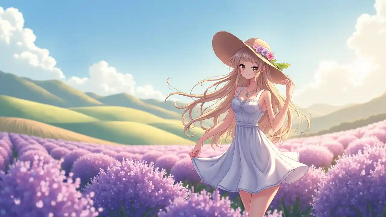 Horyzontalny obraz w dużej skali dziewczyny z serii Ultra HD, urocza i romantyczna, ogrzewająca się porannym słońcem, stojąca na lawentowym polu na zewnątrz z gęstymi wzgórzami, ubrana w letnią sukienkę z obcięciem szyi i szatą o szerokim brzegu, jej długie włosy ozdobione kwiatami i promienny uśmiech, szerokie błyszczące oczy, świecąca skóra, miękka fioletowa i zielona paleta kolorów, miękki rysunek, doskonały makiet, spokojne i romantyczne wibracje, miękkie blask i naturalne oświetlenie, które podkreśla jej urocza, dobrze zdefiniowana pierś z subtelnym dekoltem i długie, tonujące nogi z gracją, wydaj się