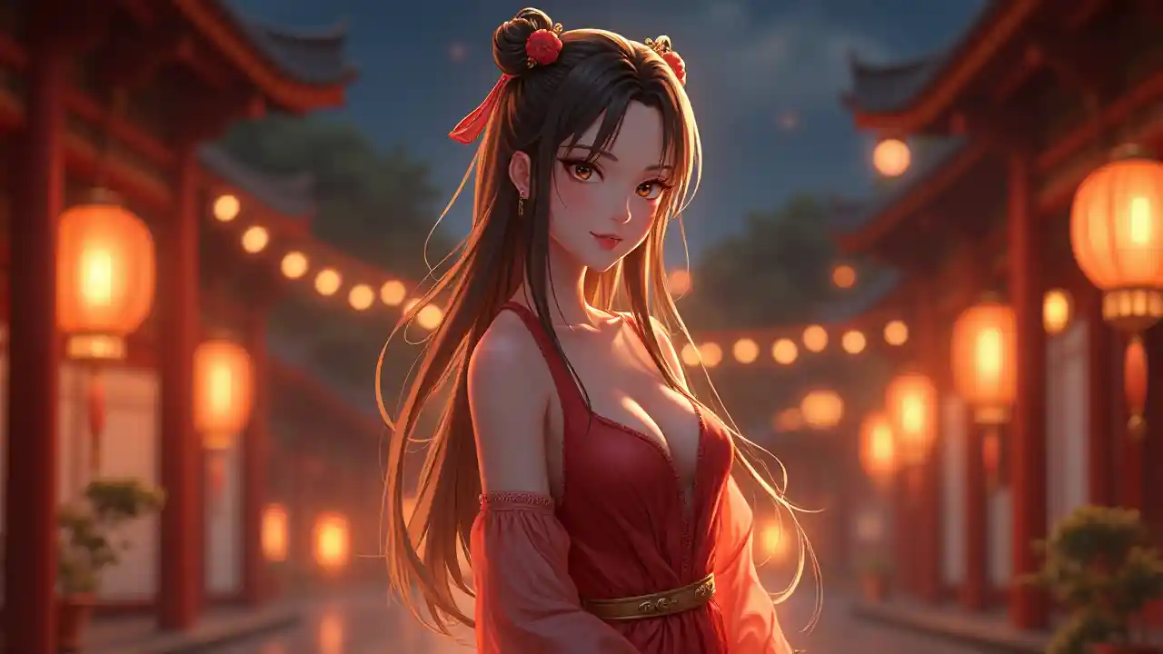 Horyzontalny obraz w dużej skali dziewczyny z serii Ultra HD, uderzająco piękna i elegancka, oświetlona blaskiem latarni, stojąca w tradycyjnym chińskim dziedzinie w nocy, ubrana w odkrywającego hanfu z głębokim wyciągiem szyi i otwartymi rękawami, jej długie włosy ozdobione sztylem i ciepły uśmiech, duże błyszczące oczy, świecąca skóra, mięca czerwona i złota paleta kolorów, ostre rysy, bezbłej makietki, spokojne i romantyczne wibracje, ciepłe oświetlenie mięczem, podkreślając jej przycią, dobrze zdefiniowane pierś z subtelnym dekoltem, a długie, wytrzymałe nogi z zrzenia, promiąc uroku i elegancji.