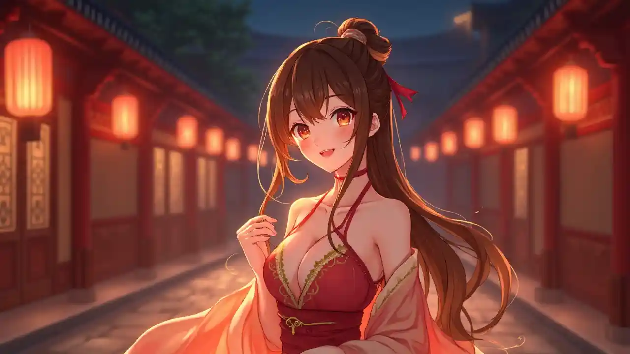 Horyzontalny obraz w dużej skali dziewczyny z serii Ultra HD, promieniowanie oszałamiające i eleganckie, oświetlone blaskiem latarni, stojąca w tradycyjnym chińskim dziedzinie w nocy, nosząca odsłaniające hanfu z głębokim wyciągiem i otwartymi rękawiami, jej długie włosy ozdobione sztyletem i ciepły uśmiech, szerokie błyszczące oczy, świecąca skóra, miękka czerwona i złota paleta kolorów, delikatne cechy, bezbłędny makiet, spokojne i romantyczne wibracje, ciepłe oświetlenie, podkreślając jej wdzię, dobrze zdefiniowane pierś z subtelnym dekoltem, a długie, wytrzymałe nogi z zrzenia, promieniąc uroku i elegancji.