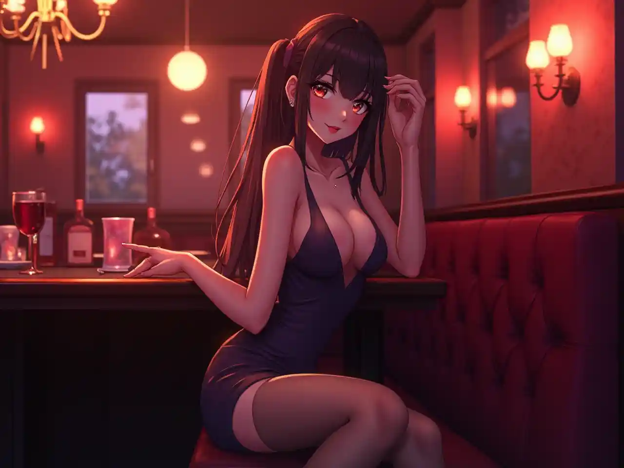 Horizontal large-scale image of an Ultra HD anime girl, stunningly beautiful and sensual, glowing under soft lamplight, sitting in an indoor jazz bar with a smoky atmosphere, wearing a sleek cocktail dress with a plunging neckline and sheer stockings, her long hair cascading over her shoulders and a sultry smile, big shimmering eyes, glowing skin, deep red and purple color palette, delicate features, bold makeup, intimate and glamorous vibes, warm lighting with a soft glow, emphasizing her alluring, well-defined chest with a subtle cleavage, and long, toned legs with a poised posture, radiating allure and sophistication.