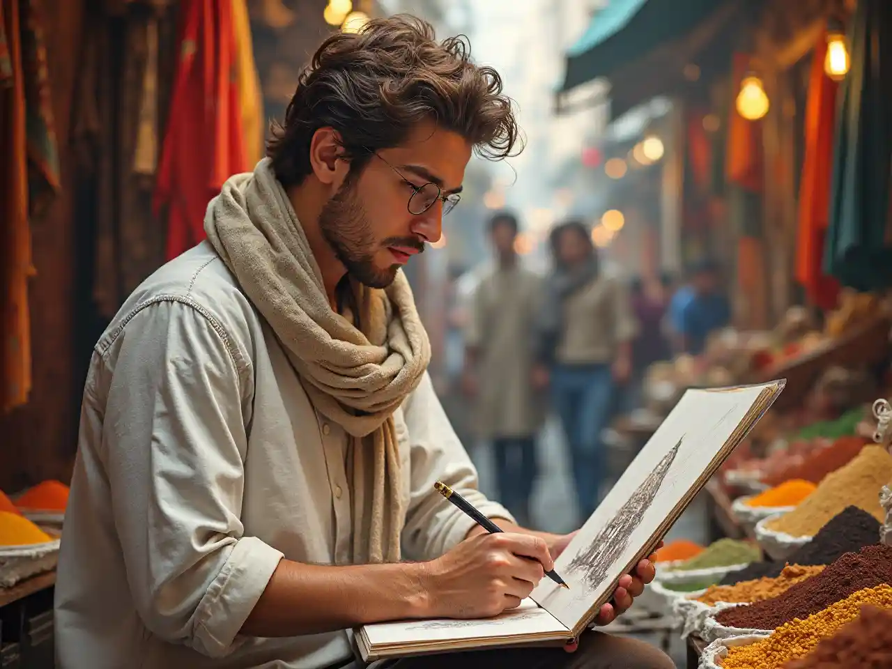 Sketching in a bustling Istanbul market, a White man in his 20s glows in a linen shirt and scarf. Spice stalls and vibrant fabrics frame him, his deft hands and focused gaze exuding artistic passion and youthful charm in a colorful, exotic setting.