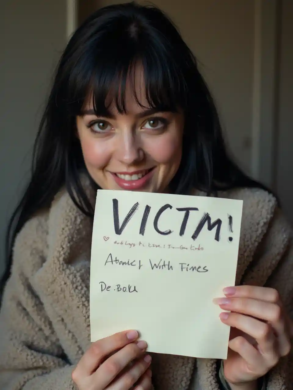 Młoda kobieta z czarnymi włosami trzyma kawałek papieru z nazwiskiem "VICTIM" napisany na nim selfie → zmieni tekst na papierze do atom