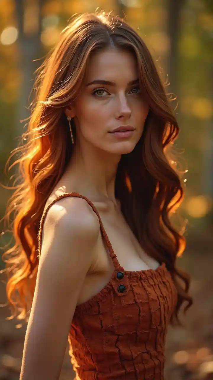 Kobieta niesamowitego piękna. Całkowita. Brązowe włosy. Widok w pełnej długości. Kiedy wiedziałaś, że to koniec, czy nagle zdałaś sobie sprawę, że jesienne liście zmieniają kolor jej włosów?