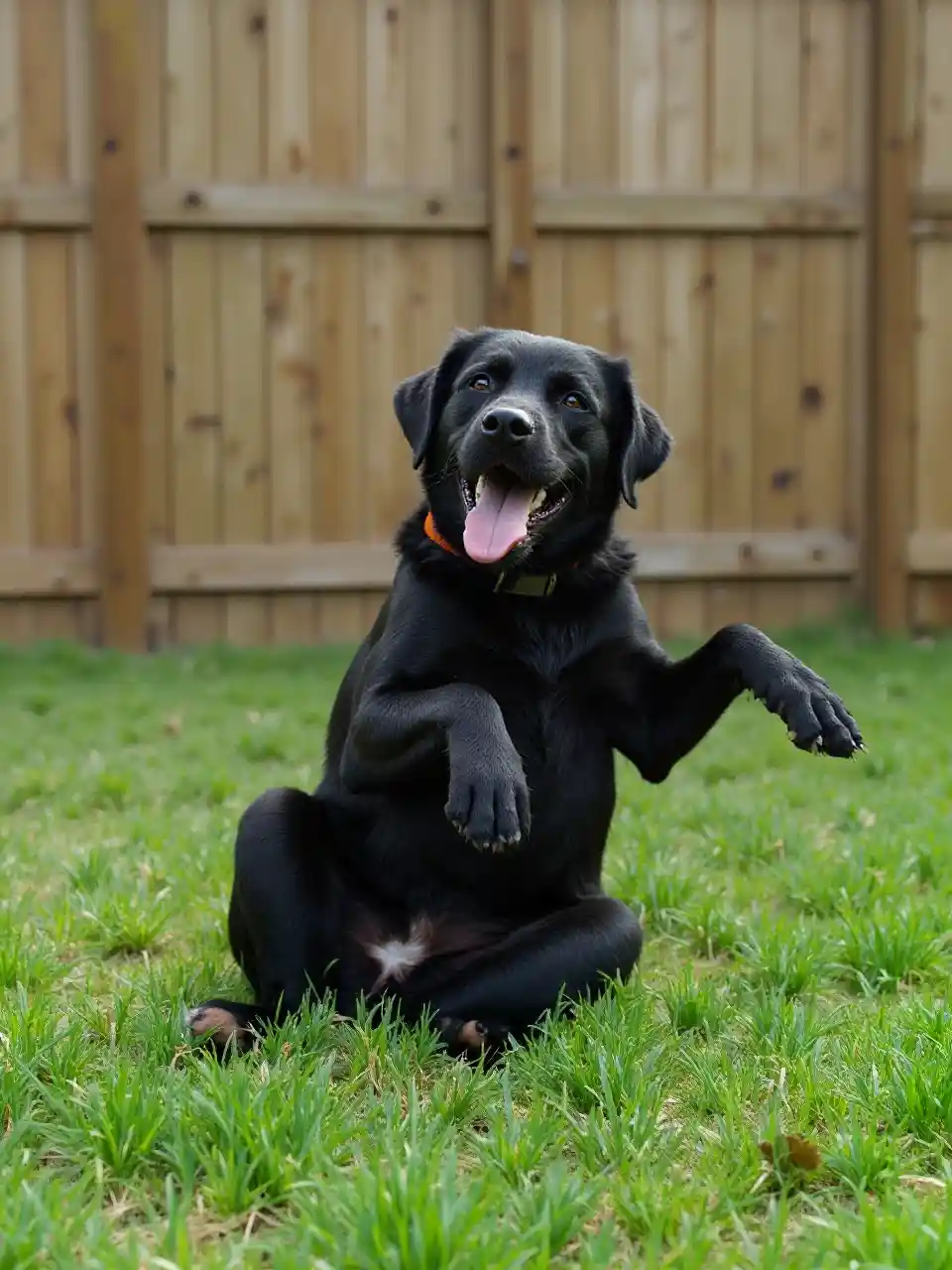 DavidBlack dog looking happy, content, silly lying on his back with legs in the air on grass in a garden with a solid wooden fence behind