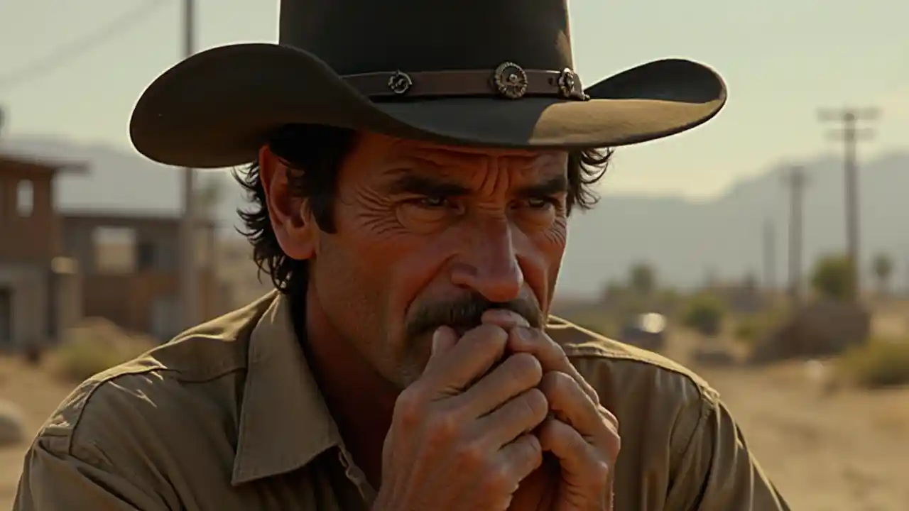 Charles Bronson, "Nadchodzący czas", scena z bliska, kapelusz kowbojski, gra na harmonii, w stylu GTA