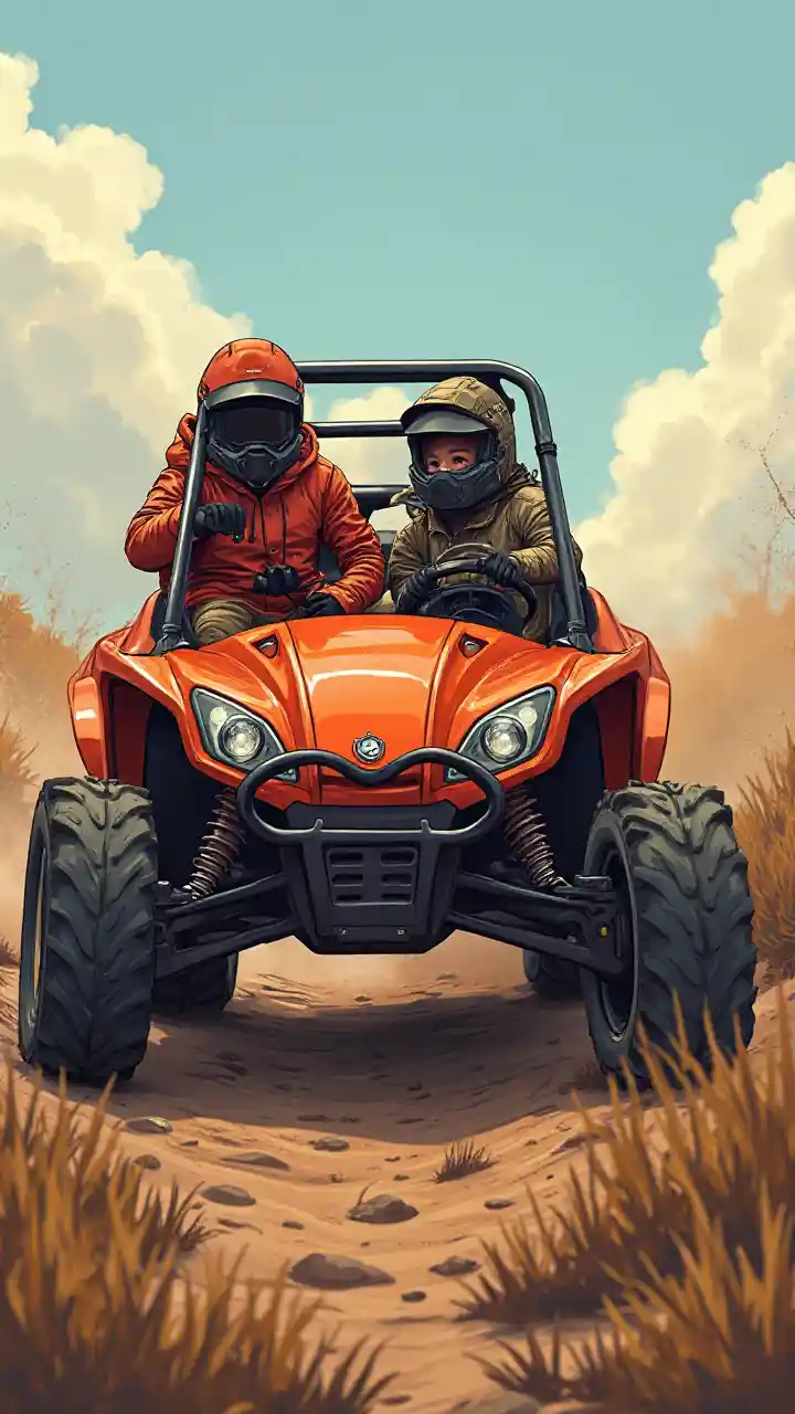 ilustração Carro Buggy Todo-o-terreno UTV-MX Cor-de-Laranja , homem forte,cabelo loiro curto , barba loira, oculos escuros vermelhos , dois filhos raoaz, rapaz jovem cabelo comprido, calções vermelhos fundo branco
