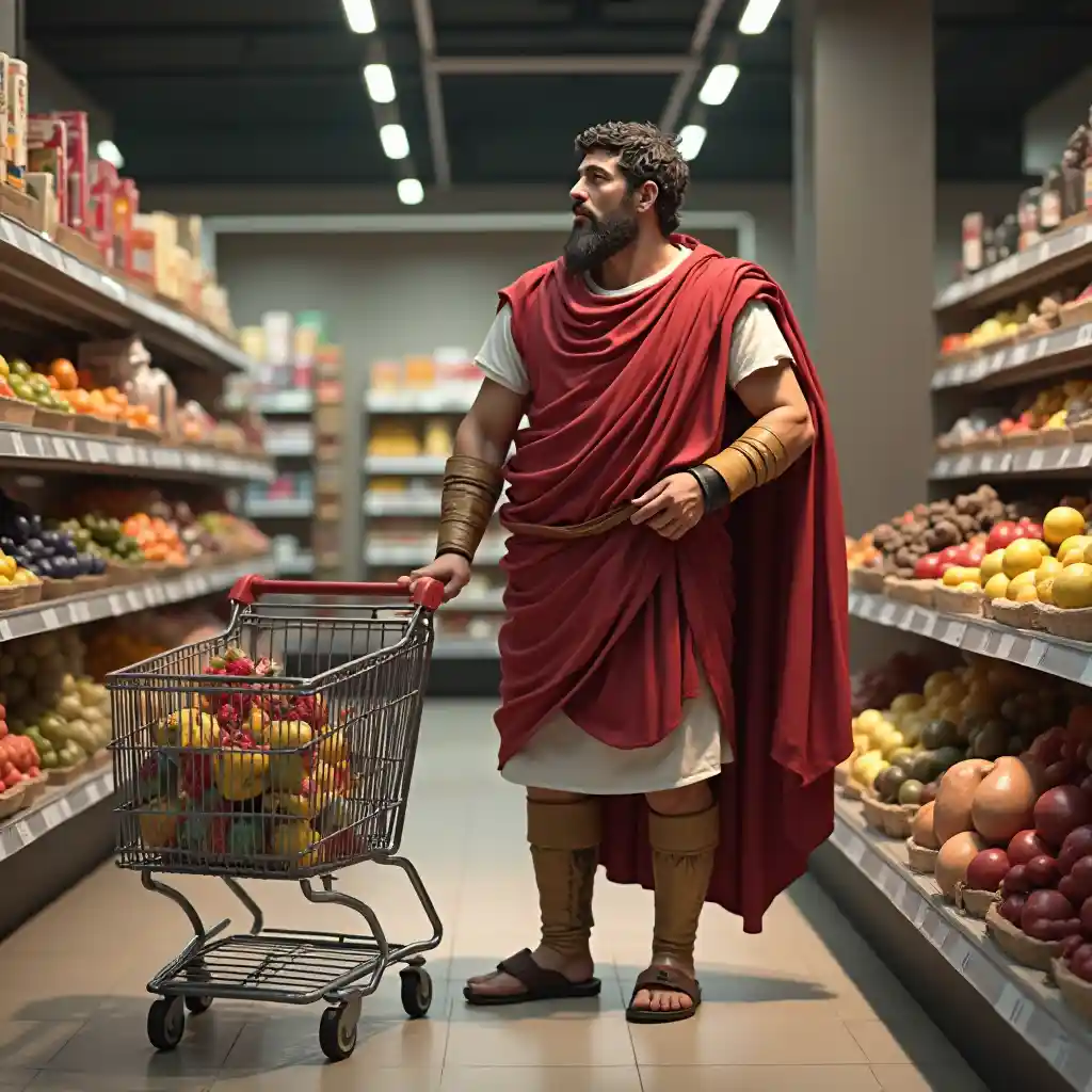 LeviJulius Caesar, starożytny cesarz rzymski robi zakupy w nowoczesnym supermarkecie. Całe ciało. Hiperrealistyczne.