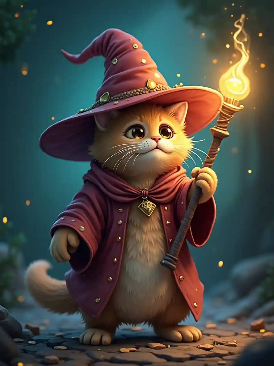 Słodki, tłusty kot, który gra w czarodziejskiej czapce, trzymający magiczną laskę, magiczny blask