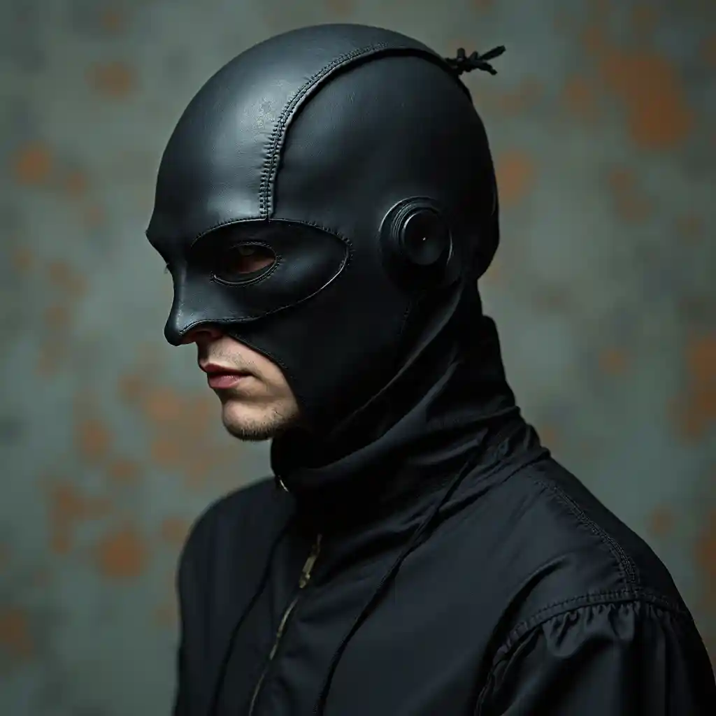 Fotografia portretów ciała, cyberpuna w czarnej masce superbohatera, widok 80 stopni, sztukę Sergio Lopeza, Natalie Shaw, Jamesa Jeana i Salvadora Dali
