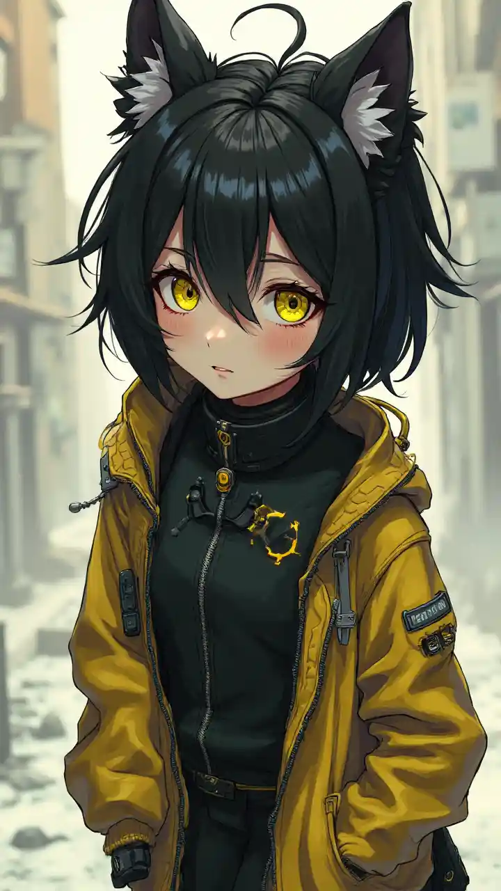 (sztukę arcydzieło:1.2), (najlepsza jakość:1.2), (ultra highres:1.2) , ((8k resolution:1.2), Cyberpunk, mechaniczna dziewczyna, czarne włosy, żółte oczy, maleńka, słodka, akcja psów, cienka, czarna i żółta,