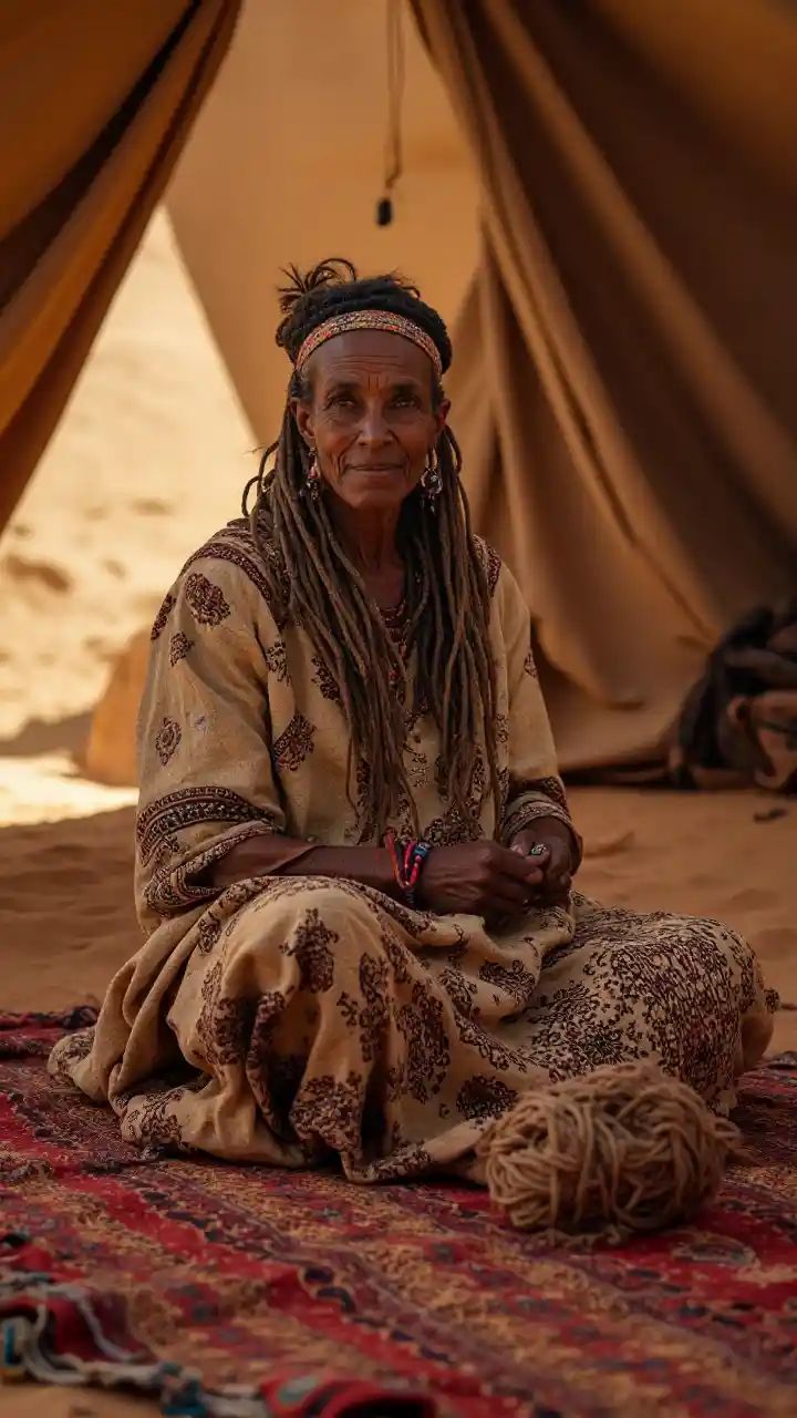 75-letnia Afrykanka z dreadlockami, która tka dywan w pustyni, nosi szatę zszywaną z wyd. Burze piaskowe i stado wielbłądów obrazują ją, jej zwinne palce promieniają umiejętnością i nomadyczną dumą w surowej historii. Jej wzory mówią o podróżach.