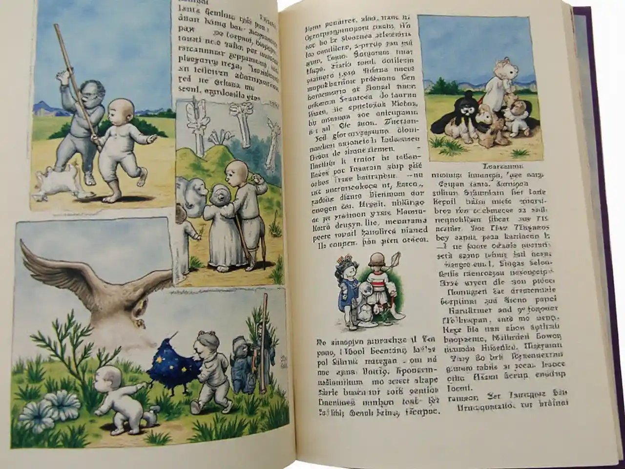 EmeryOgromna otwarta księga. W środku jest świat dinozaurów. Niezapomniany niebieski kwiat.