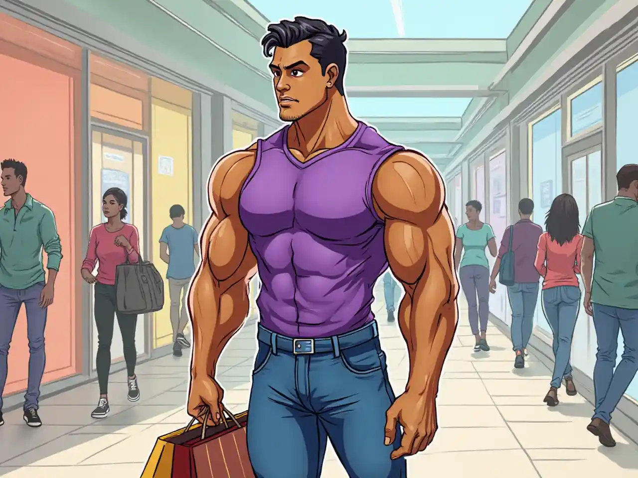 narysować bardzo przystojnego taniego kulturystę noszącego fioletową koszulę bez rękawiczek i niebieskie dżinsy, kupując w centrum w New Jersey