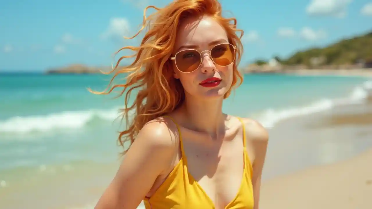 atrakcyjna holenderska czerwona dziewczyna, na plaży, żółty modny kostium kąpielowy, czerwona szminka, piegi, zabarwione okulary słoneczne, ciepłe kolory