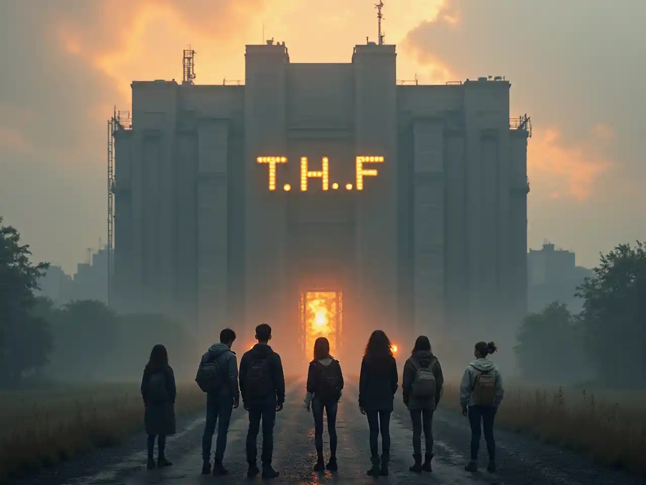 Ludzie stojący przed gigantycznym budynkiem, który ma słowa T.H.F. spraw, by wyglądał jak okładka książki fikcyjnej i spraw, aby było dystopicznie