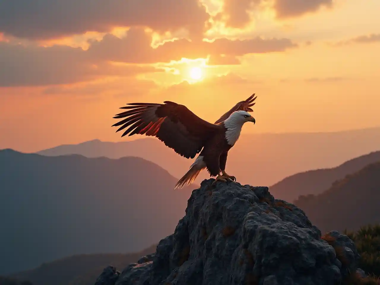 Orzeł stojący na szczycie góry z zamkniętymi skrzydłami wschodzie słońca