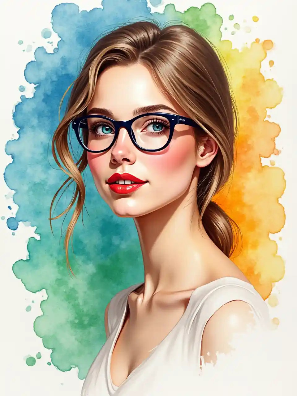 Portret akwarelistyczny młodej kobiety z okularami, namalowany w realistycznym stylu z żywymi kolorami i miękką, malarską teksturą. Kobieta, która wydaje się być w wieku dwudziestu lat, jest umieszczona w środku obrazu, patrząc bezpośrednio na widzący z neutralnym wyrazem. Ma jasną skórę, niebieskie oczy i szczupły fizyk. Występuje w postaci koloru, który nadaje jej neutralny wygląd. Tło składa się z kolorowych, abstrakcyjnych plam błękitnych, zielonych, żółtych i pomarańczowych, tworząc żywą i dynamiczną kompozycję.