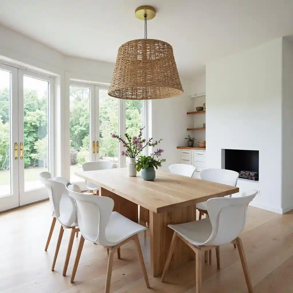 Nowoczesna jadalnia w stylu wiejskiego z dużym drewnianym stołem, białymi krzesłami i tkaną lampą. Pokój ma duże okna, białe ściany i kominek w tle