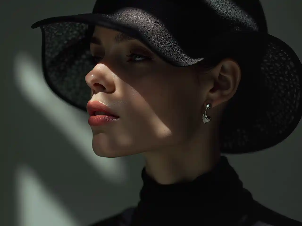 Modne zbliżenie modelu inspirowanego przez Lillian Bassman, z wymiarowym oświetlenie i w pełni symetryczną kompozycją, uchwytując całe ciało z artystycznym dotykem przypominającym Serge'a Lutensa, łącząc elegancję i awangardowy styl ze szczególnym uwzględnieniem dramatycznych cieni i płynnych form.