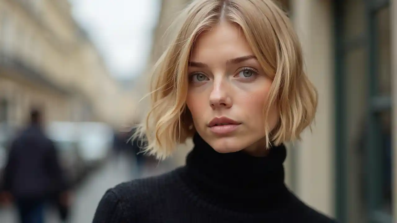 Piękne modele mody, blondynki, czyste oczy, czarny sweter z podgarnitem, widok twarzy, fryzura, portret z bliska, film, jakość fotografii, wysoki szczegół, wysoka jakość.