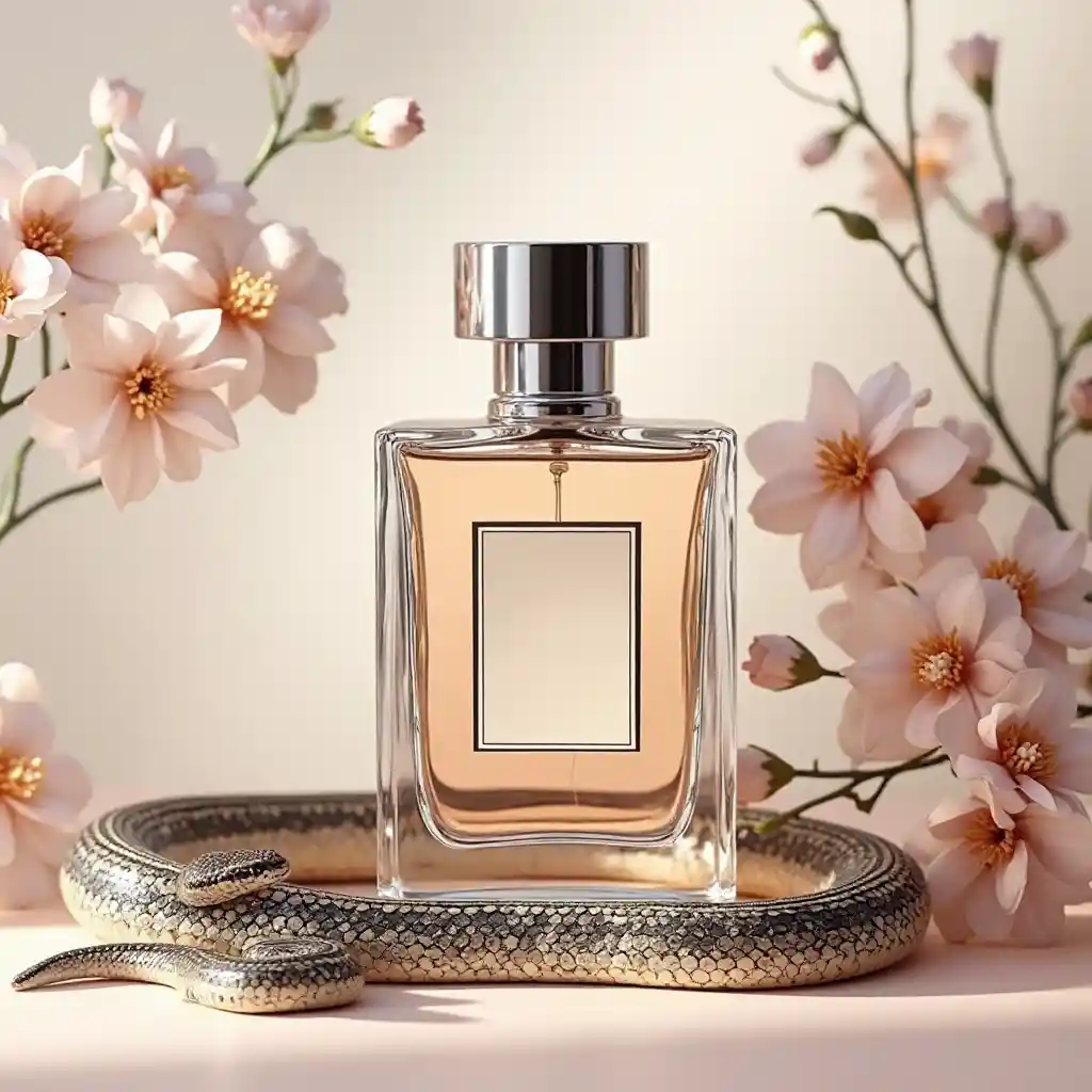 Floral background with minimalistic perfume bottle and snake next to the bottle