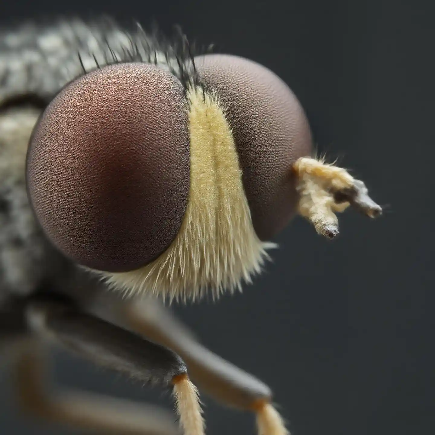 "Nagrodzona makro fotografia zwykłej muchy domowej, uchwycona w największym szczegółie. Złożone struktury jego złożonych oczu, delikatne przezroczyste skrzydła i