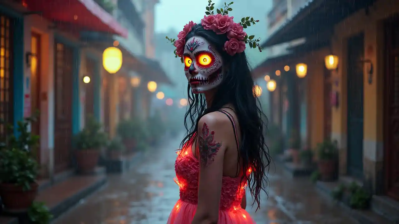 Dziewczyna, maska oni, błyszczące akcenty neonowe, realistyczne, 4k, zdjęcie całego ciała, deszcz, błyszcząca sukienka, styl Día de los Muertos, ręce mechaniczne, przezroczyste, przezroczyste ubrania, w scenie starego miasta
