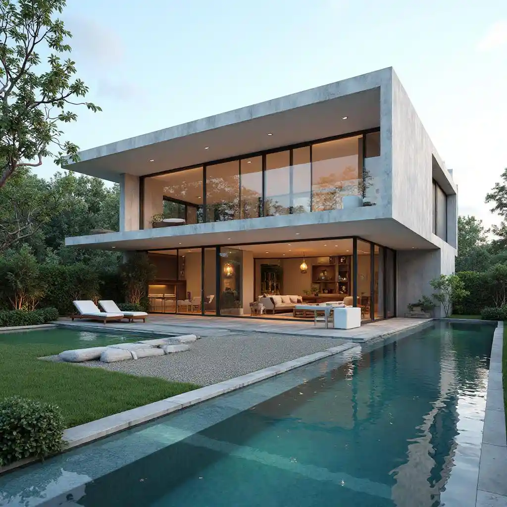 laaaaraNowoczesny dom w kształcie litery L ze ścianą zasłonową, szklane okna, otwarty plan, przestronny z basenem