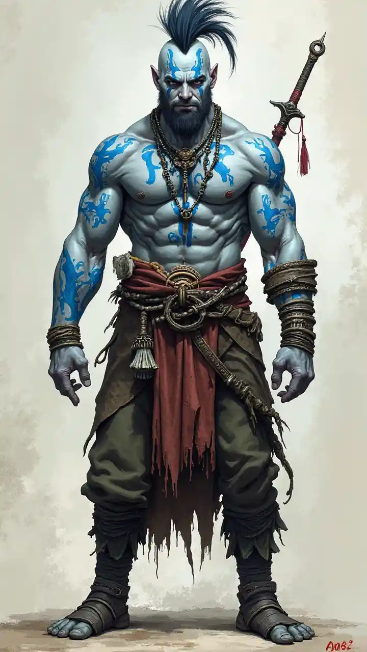 JacobPostać D&D, Goliath, bródka, niebiesko-biała skóra z niebieskimi tatuażami plemiennymi, mohawk i barbarzyński