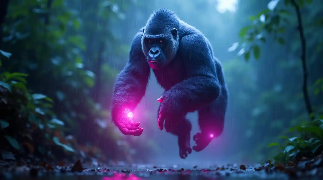 WilliamZdjęcie lewującego, świecącego różowo i niebiesko goryla, ujęcie filmowe, deszcz, rozmyte drzewa dżunglowe w tle
