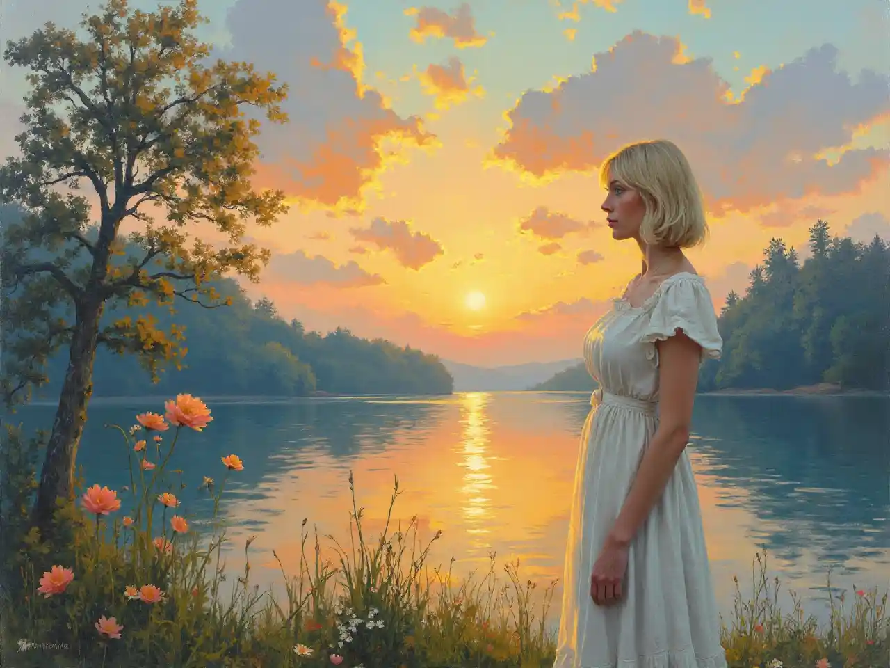 Impresjonistyczny obraz w stylu Claude'a Moneta przedstawiający spokojne jezioro przyschodzie słońca. Na pierwszym planie stoi pełna ciała młoda kobieta z krótkimi blond włosami i niebieskimi oczami, która patrzy na kraj. Ubrała lekką sukienkę, która odbija ciepłe kolory zachodu słońca. Scena wypełniona jest luźnymi i żywymi pociągami pędzla, które uchwycają istotę przyrody w ruchu.