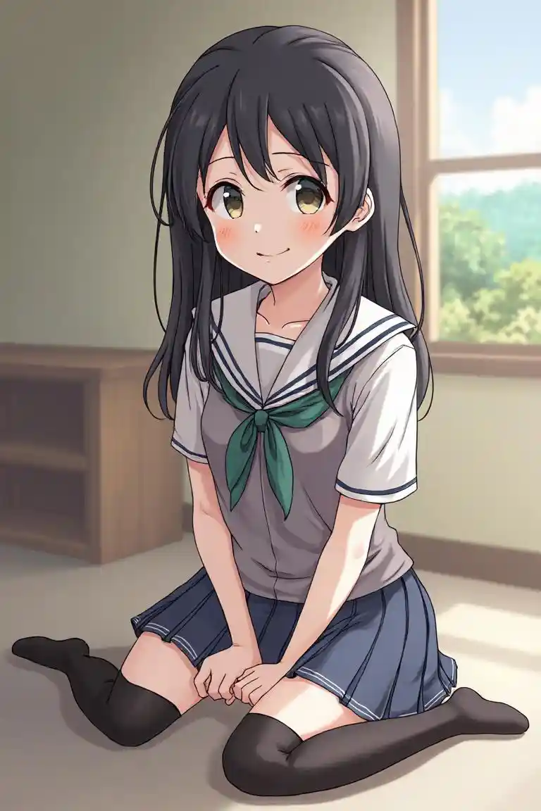 OwenSłodkie ciemnoskórze japońskie kobiety 8 studentek szkoły średniej Seizza Sied cross-legged cute eyes Smile high socks crouching Group uniform skirt J