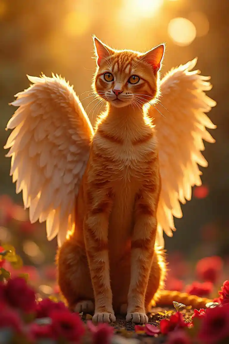 SkylarKajita, Kobieta Kot z jasnopłaszczowym futrem z błyszczącymi złotymi pasami i aniołskimi skrzydłami na plecach, pozująca w niebiańskim ogrodzie o świcie, otoczona płatami róż