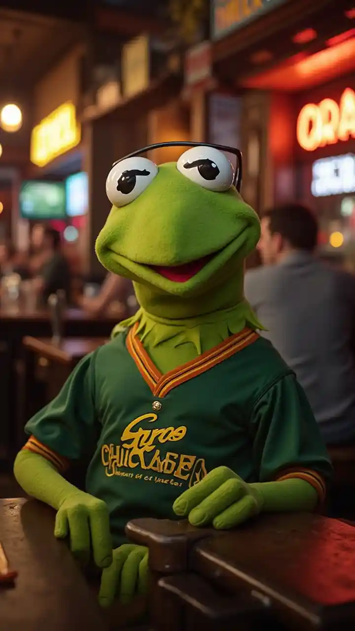 Kermit Żaba w tawernie w Chicago w kolorach Loyola Chicago