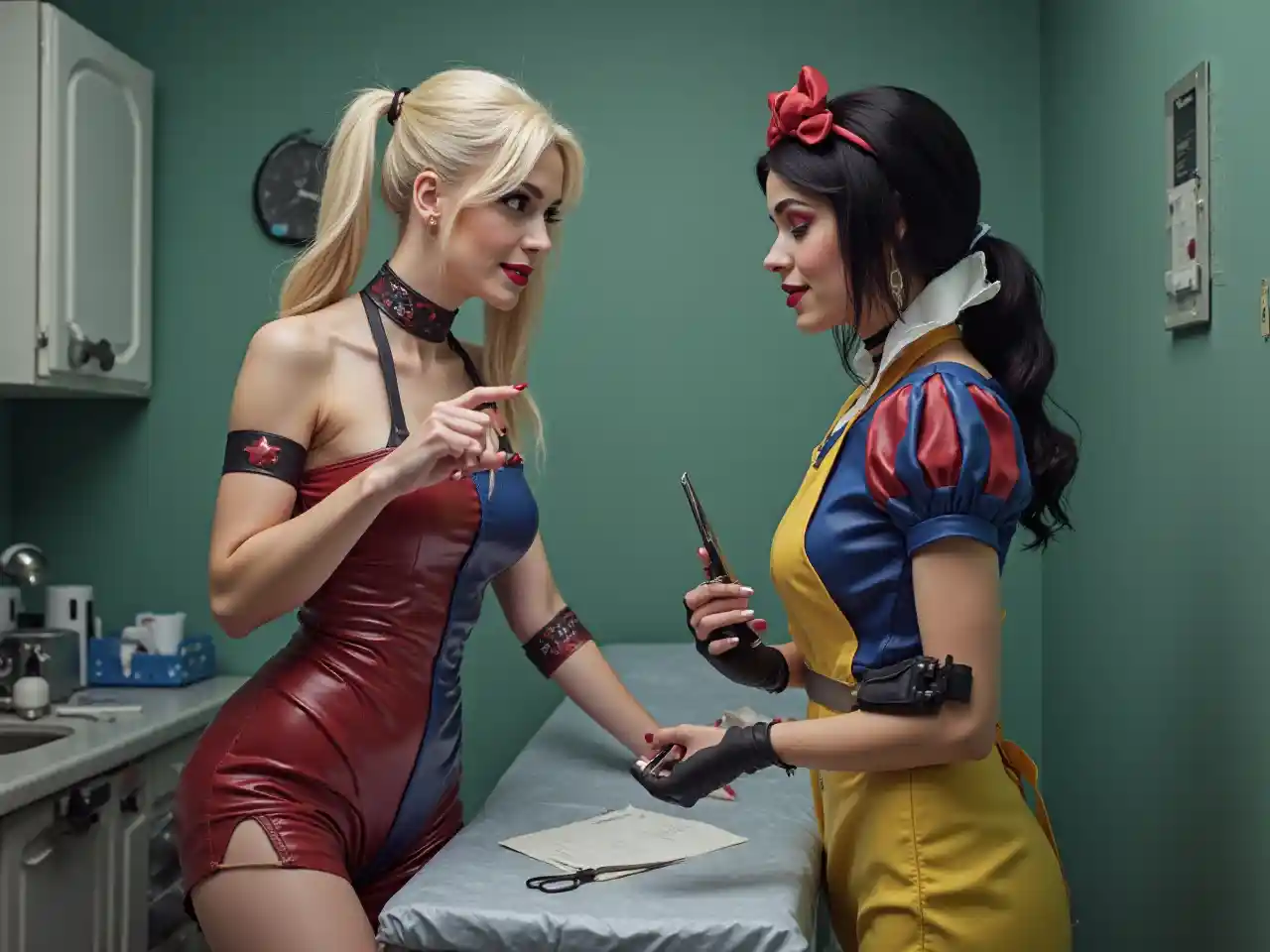 Harley Quinn i Śnieżka ubrane w latex z jednorazowym fartuchem, trzymające brzytkę i nożyczki stojące przy stole egzaminacyjnym