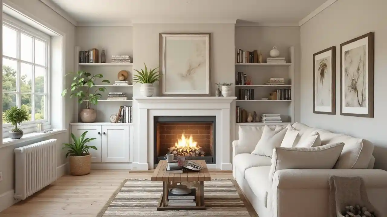 Stwórz obraz salonu z wnętrzem wliczonym, który ma 20 stóp x 20 stóp z 7 stóp sufitu, okno na dwóch sąsiadujących ścianach, które są bardzo domem, neutralne ściany, półki na jednej ścianie, kanapa sekcjonalna, która staje przed ścian z kominem, zawiera drzwi wejściowe, które prowadzą do uroczego obszaru chodni z stołem bocznym/lustrem