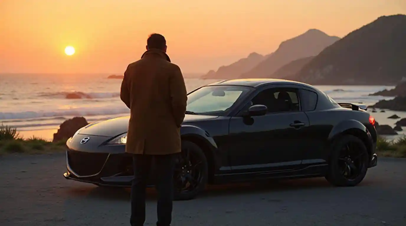 black mazda rx-8 against sunset and man in coat standing behind car looking at ocean