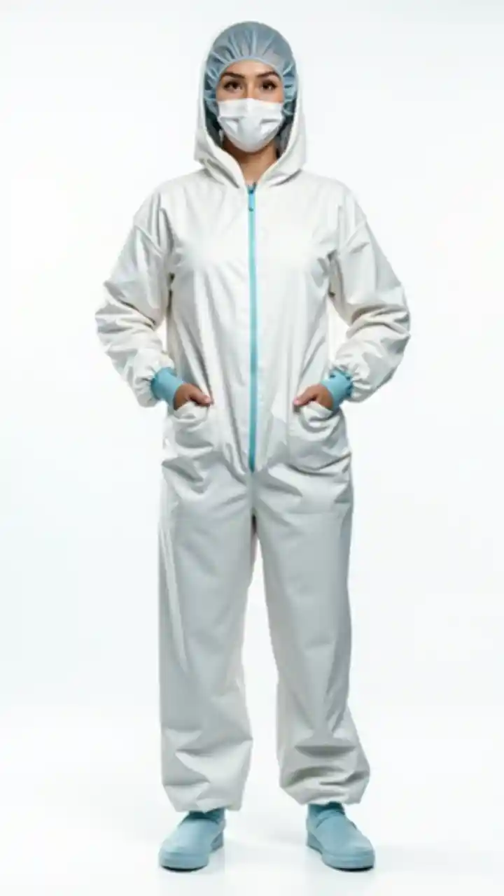 KittyRealistyczne zdjęcie kobiety w kombinezonie medycznym, jednorazowym kombinezonie z oddychającą tkaniną, izolowane, białe tło