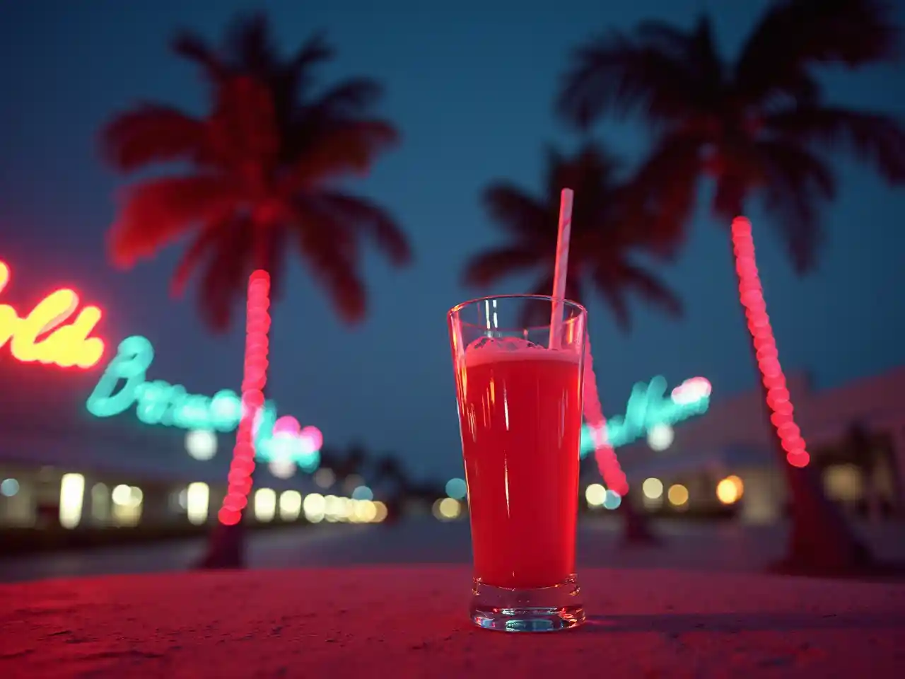 Lata 80. Miami, neon, palmy, czerwony kubek