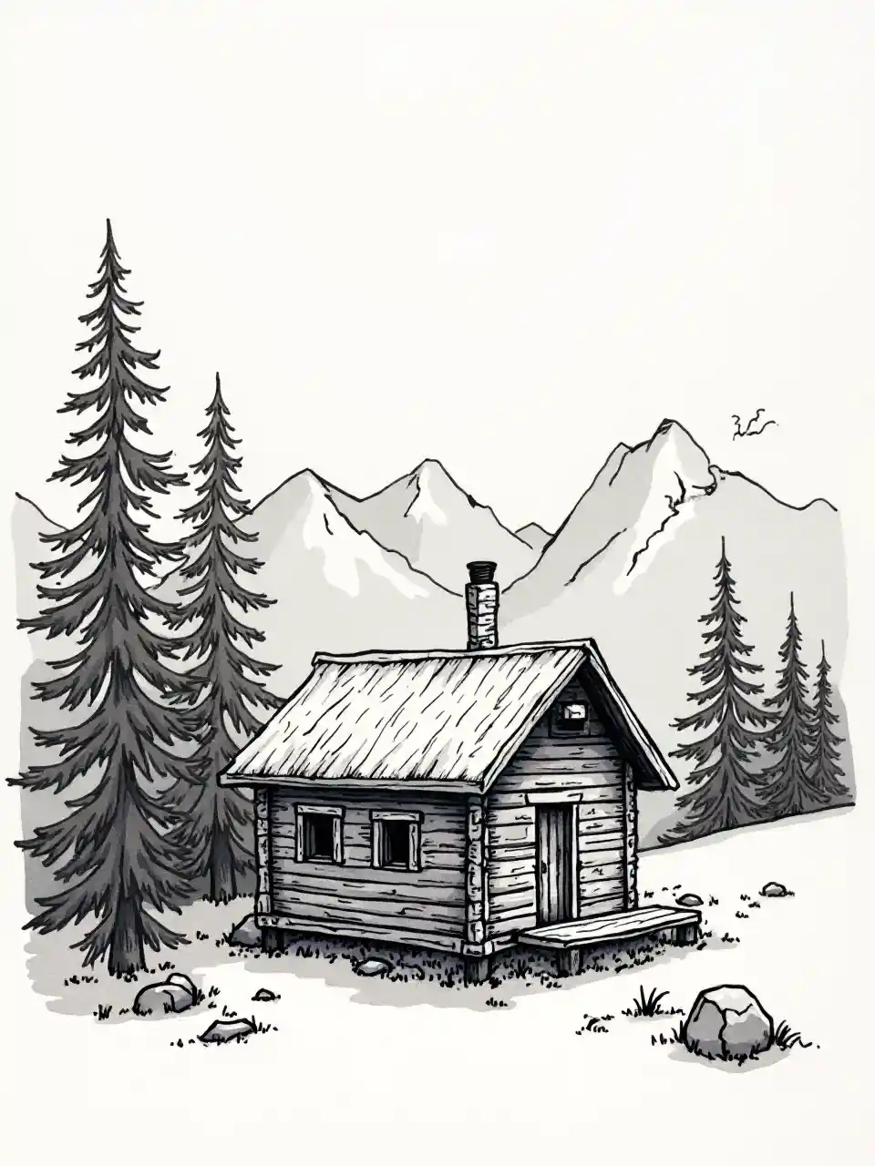 Łatwe minimalne rysunki długopisem i atramentem, dym z komina, drzewa po lewej, góry z tyłu i po prawej.