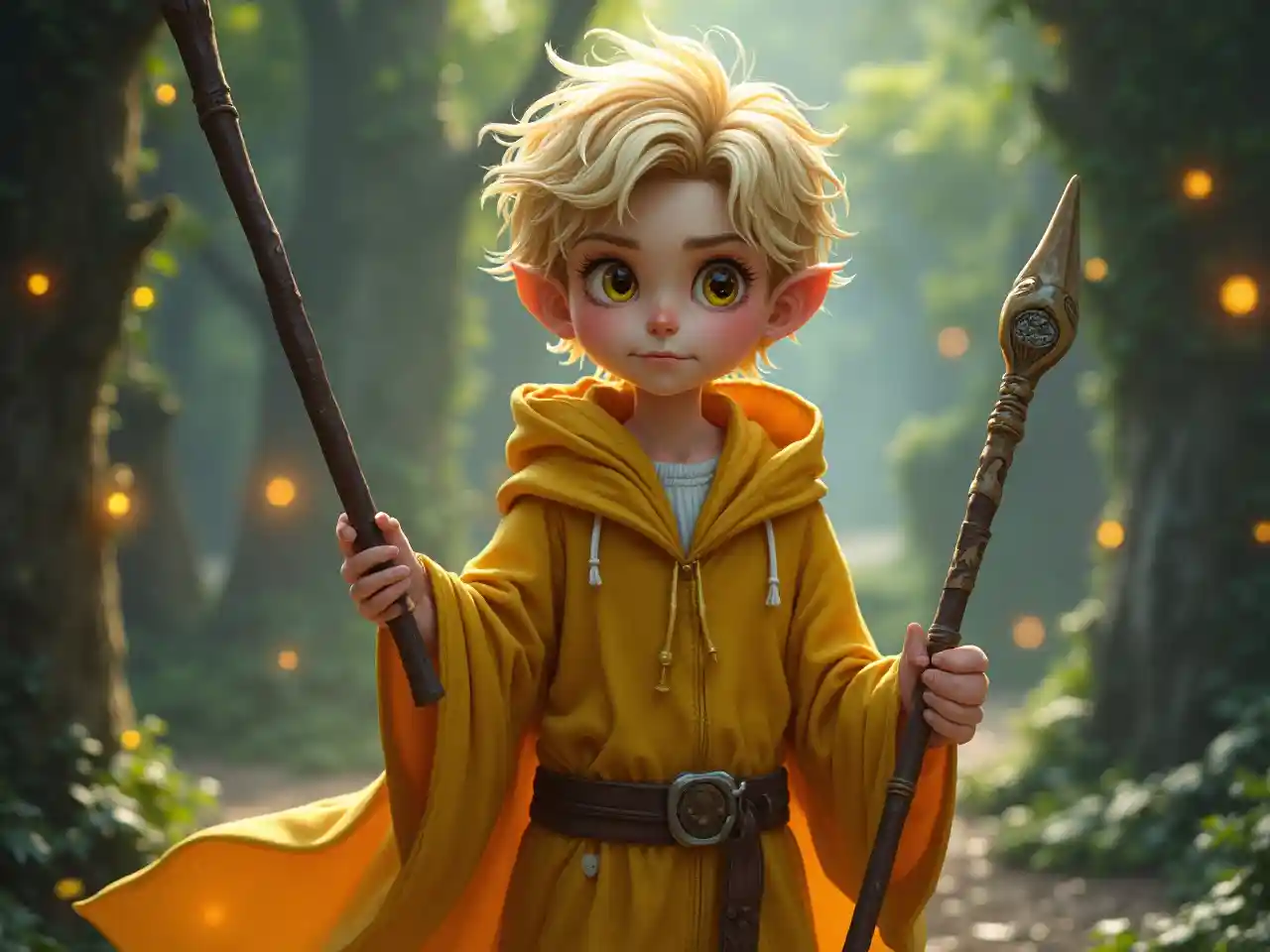 Bardzo złośliwy 8-letni męski czarodziej w świecie fantazji z krótkimi, piaszczystej blond włosy i złotymi oczami, noszący żółtą szatę z magiczną laską.