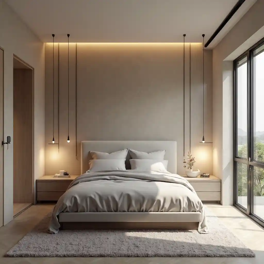szczegółowe rendering 3D nowoczesnego, minimalistycznego kąta sypialni, prezentujący unikalne cechy architektoniczne. Projekt powinien wyróżniać się specjalnymi materiałami i zawierać innowacyjne elementy oświetlenia. Użyj 3ds Max i V-Ray do realistycznego renderowania, koncentrując się na teksturach i atmosferze, aby stworzyć spoko