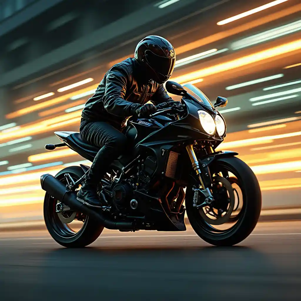 Stwórz dynamiczny obraz motocyklisty w ruchu, uchwycony z efektem panerowania. Jeździec pochyla się w kierunku skrętu na eleganckim, silnym motocyklu, w którym jest śmiały hełm, który nosi skórzaną kurtkę. Tło to rozmyte przez ruch pasy o żywych kolorach, podkreślające prędkość i energię. Paleta kolorów obejmuje czarny dla roweru i konturów, a złoty dla akcentów i podkreślenia, tworząc uderzający i skoncentrowany kompozycji. Hiperrealistyczne zdjęcia. 4d