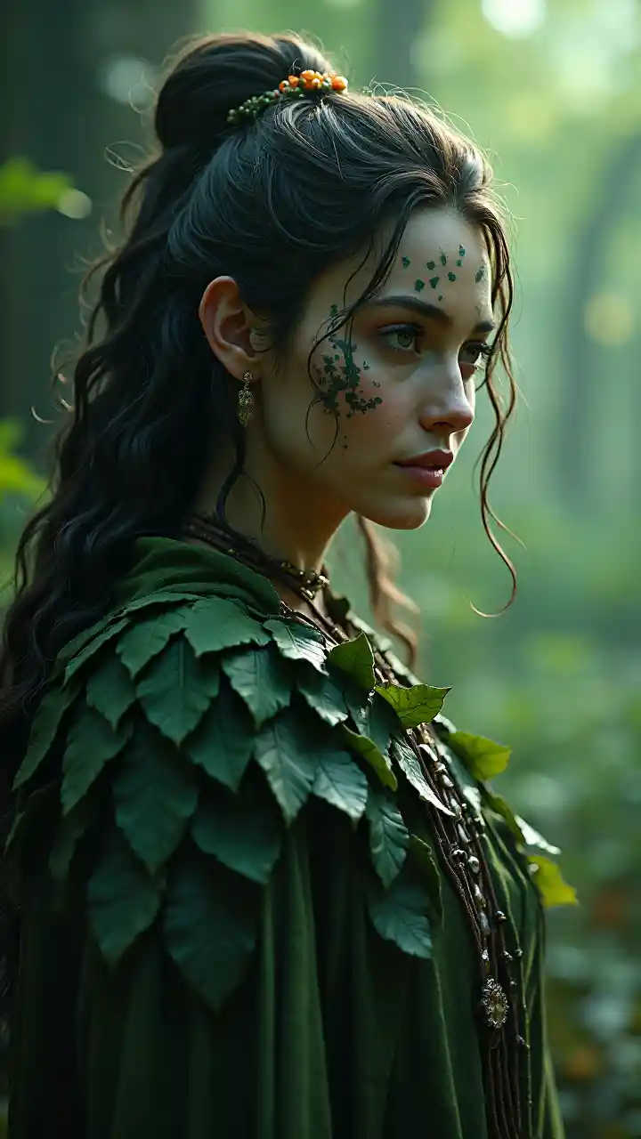 Cyfrowa sztuka przedstawiająca druida w świecie fantazji, zaprojektowana do zdjęcia profilowego. Druid nosi ubrania z liści i ma skomplikowane tatuaże na twarzy. Scena jest oświetlona kinematograficznym oświetlenia, podkreślając mistyczną aurę druida. Obraz jest najwyższej jakości, odzwierciedlający istotę i charakter druida. Kompozycja unika niskiej rozdzielczości, błędów tekstowych i elementów niskiej jakości, takich jak artefakty jpeg lub zniekształcenia. Sztuka utrzymuje realistyczną anatomię i proporcje, unikając wszelkich zniekształceń lub anomalii, takich jak dodatkowe kończyny lub stopione cechy. Koncentrujemy się na czarującym obrazie druida, pozbawionym jakichkolwiek rozproszeń, takich jak znaki wodne lub podpisy.
