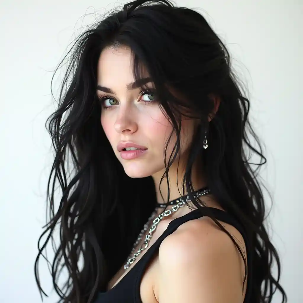 Profil atrakcyjnej białej kobiety, około 20 lat, bardzo blada skóra, młodzieńcza, mały nos, długie, obszerne, czarne włosy, gwiazda rocka, białe tło, słodkie, zielone oczy, pełne usta, oczy z dymem, makijaż, czarny top, srebrne kolczyki