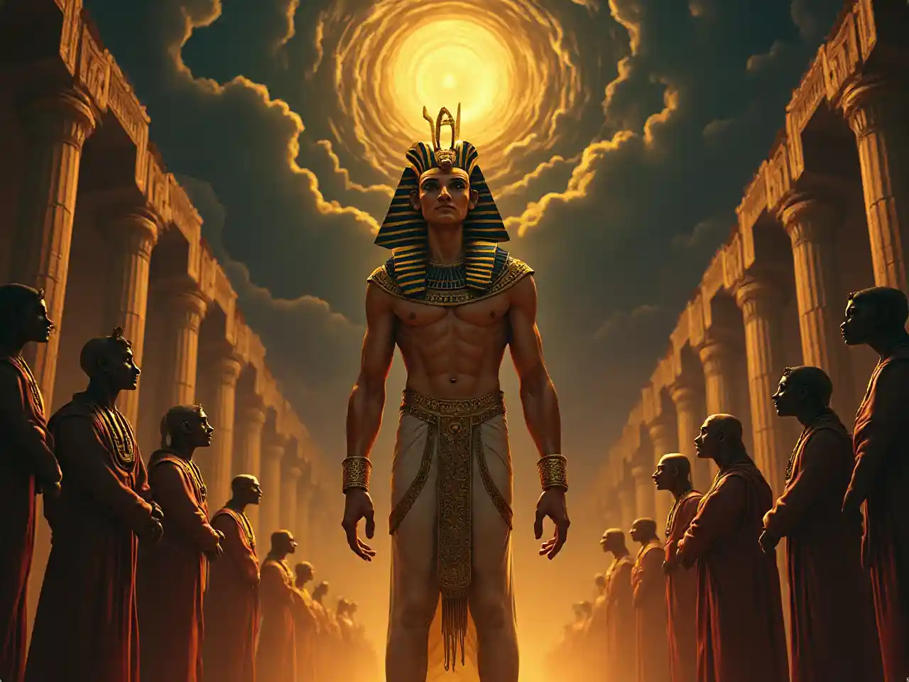 Rysuj potężnego boga Ra, stojącego wysokiego, z jego złotą skórą, noszącego tradycyjną egipską nakrycie głowy z świecącą płytą słoneczną, osadzoną w starożytnym dziedzińcu niebieskim pełnym kolumn i hieroglifów, egipskich bogów ubranych w skomponowane szaty, który stoi wokół niego, ciemne niebo z wirującymi chmurami, który się nad nim rozcią, hiperrealistyczny, foto-realistyczny, kinematograficzny --ar 9:16.