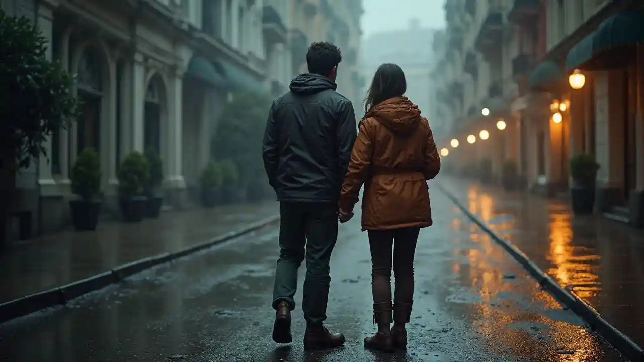 Para stojąca pod deszczem