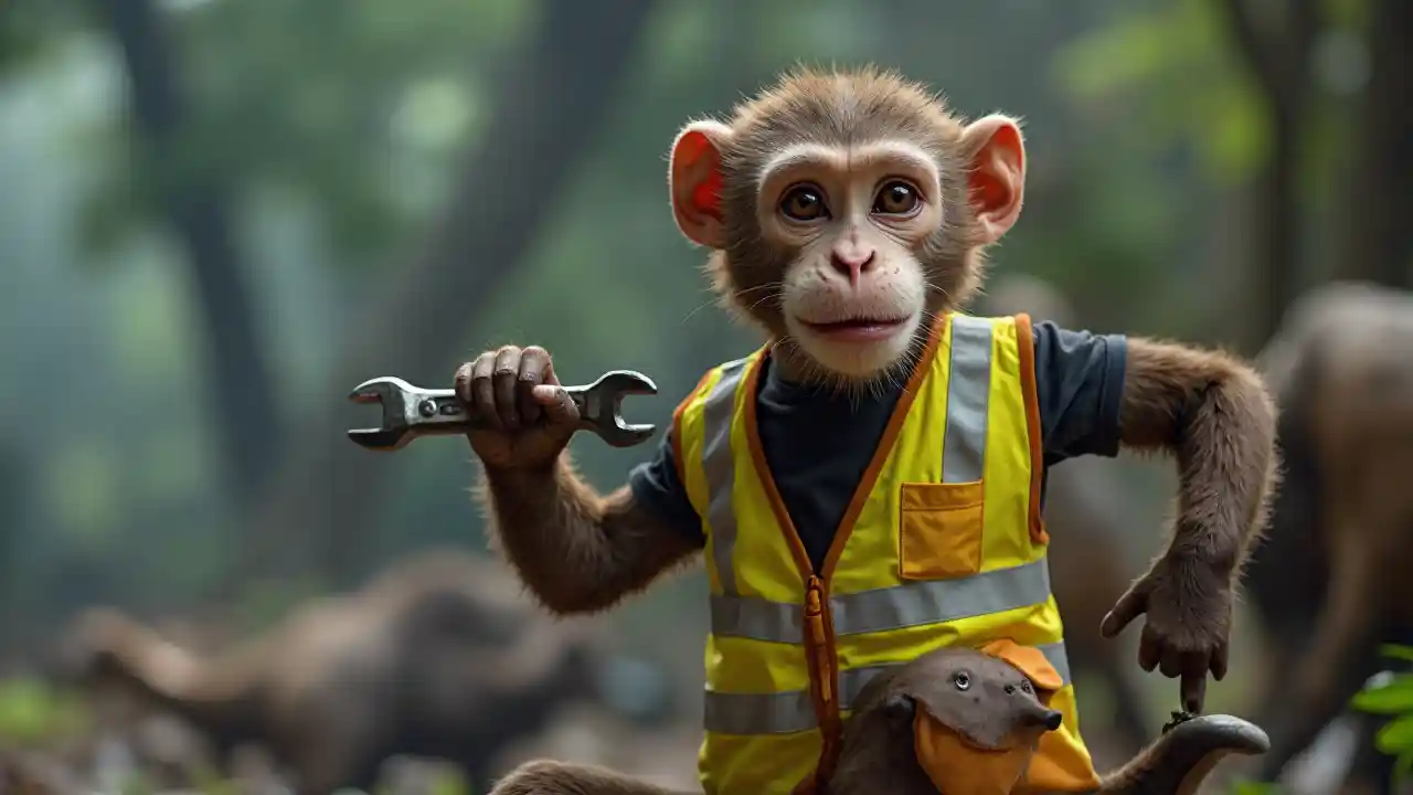 Małpa z kluczem w kamizelce odblaskowej